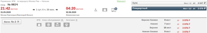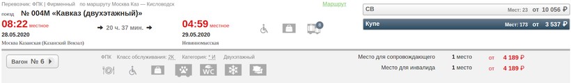 Дешевле всего обойдется билет в купейный вагон — от 3537 рублей (за 30 дней до выезда). Кстати, нижняя полка стоит дороже, чем верхняя. За место в СВ придется заплатить от 10 056 рублей. Состав № 004М является участником программы динамического ценообразования, что дает возможность сэкономить на проезде, если покупать билеты заранее.
