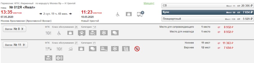 На октябрь-ноябрь минимальная стоимость билета в Новый Уренгой составляет 3371 (поезд 110Э, Плацкарт), а максимальная — 31334 (поезд 012Я Ямал, Люкс).