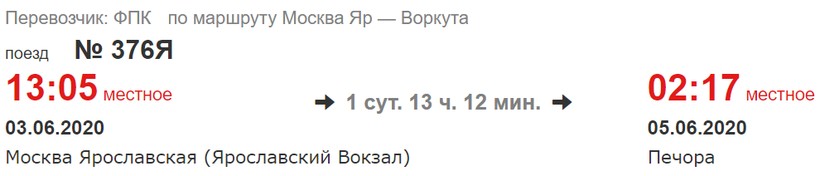 Отправление днем или вечером с Ярославского вокзала, прибытие посреди ночи на железнодорожную станцию Печора. Продолжительность поездки 1 д. 7–13 ч.