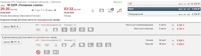 На октябрь-ноябрь минимальная стоимость билета в Печору составляет 1548 (поезд 376Я, Сидячий), а максимальная — 20562 (поезд 022Я Полярная Стрела, Люкс).