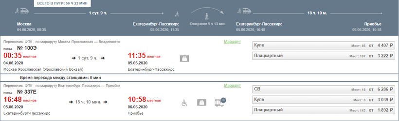 В дни отсутствия прямого состава можно добраться, совершив пересадку в Екатеринбурге. Получится немного дольше и на несколько сотен рублей дороже. Сначала нужно садиться в 00:35 на поезд № 100Э, прибытие на вокзал Екатеринбург-Пассажирский — 11:35, в дороге — 1 сут. 9 ч. Вагоны новые, оборудованы системой кондиционирования и вакуумными туалетами. Розеток большое количество, полки удобные, в купе выдается дорожный набор. Проводники работают качественно, в вагонах чисто, моют регулярно, а к пассажирам относятся внимательно. Нужно подождать 5 ч. 13 мин. и (на этом же вокзале) в 16:48 сесть на пассажирский поезд № 337Е. Прибытие — 10:58, продолжительность поездки — 18 ч. 10 мин. Поезд неплохой, санузлы почти все био, кондиционеры работают исправно, розеток достаточное количество. Полки удобные, матрасы и подушки новые и без пятен. Проводники качественно обслуживают пассажиров, вовремя приносят заказы, общаются вежливо. Влажная уборка проводится регулярно, внутри чисто и приятный запах.