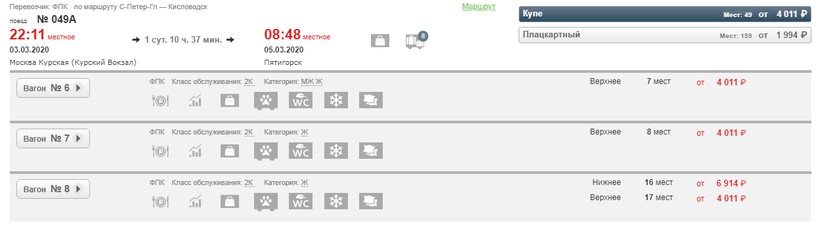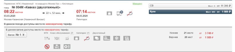На октябрь-ноябрь минимальная стоимость билета в Пятигорск составляет 1888 (поезд 049А, Плацкарт), а максимальная — 23335 (поезд 004М Кавказ, Люкс).