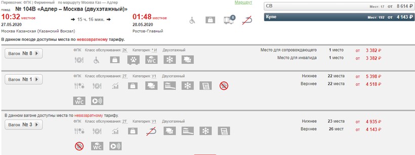 За месяц до выезда билет в купе стоит 4143 ₽, в СВ — 8238 ₽. Цены динамические, могут меняться (часто в сторону увеличения) ближе к выезду. На это влияет количество свободных мест и популярность направления. Покупайте билеты минимум за 30 дней до отбытия, на верхние полки (они дешевле), а также по невозвратному тарифу (сможете немного сэкономить, но в случае форс-мажора вернуть проездной не получится).