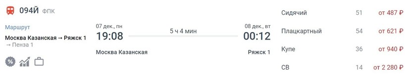 На ноябрь-декабрь минимальная стоимость билета в Ряжск составляет 559 (поезд 094Й, Сидячий), а максимальная — 4984 (поезд 306М, Люкс).