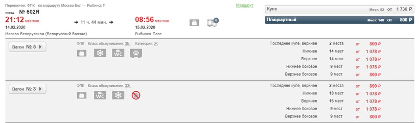 На ноябрь-декабрь минимальная стоимость билета в Рыбинск составляет 791 (поезд 602Я Рыбинск, Плацкарт), а максимальная — 28020 (поезд 924В, Люкс).