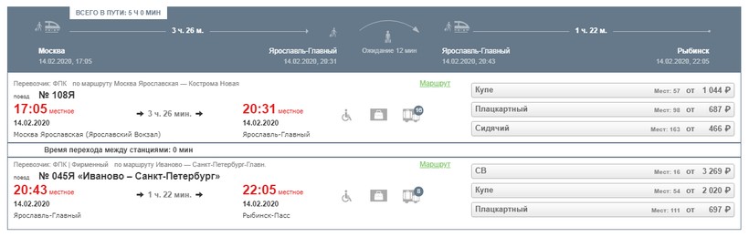 Состав № 108Я и фирменный поезд № 045Я «Иваново — Санкт-Петербург». Отправление из Москвы приблизительно в 17:00, на станцию Ярославль-Главный прибывает в 20:31. Ожидание следующего состава — 12 минут. Отправляется он в 20:43, прибытие в пункт назначения — 22:05. Все путешествие займет ровно 5 часов. Это самый быстрый вариант проезда.