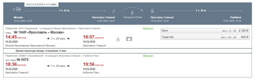 Фирменный поезд № 104Я «Ярославль — Москва» и электричка № 6575. Отправляется из Москвы (Ярославский Вокзал) в 14:45, прибытие на Ярославль-Главный в 18:07. На пересадку дается 29 мин.