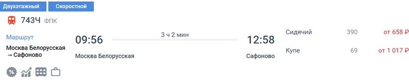 На ноябрь-декабрь минимальная стоимость билета в Сафоново составляет 240 (поезд 735М ЛАСТОЧКА, Сидячий), а максимальная — 3548 (поезд 055Б SOZH, Люкс).