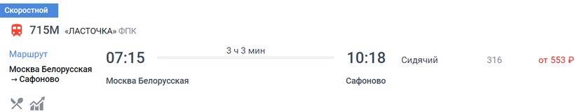 № 715М — выезжает в 07:15, прибытие в 10:18/10:14 — подойдет людям, которым нужно быть в Сафоново уже с самого утра;