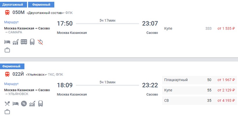 На октябрь-ноябрь минимальная стоимость билета в Сасово составляет 554 (поезд 392У, Сидячий), а максимальная — 11383 (поезд 022Й Ульяновск, Мягкий).