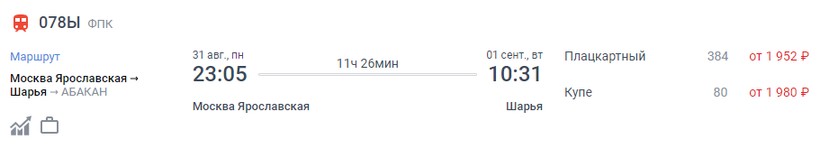 На октябрь-ноябрь минимальная стоимость билета в Шарью составляет 1053 (поезд 078Ы, Плацкарт), а максимальная — 2702 (поезд 078Ы, Купе).