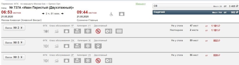 № 739А — для тех, кто не любит вставать рано, поезд отбывает в 13:31, прибывает в 16:22, через 2 ч. 51 мин.