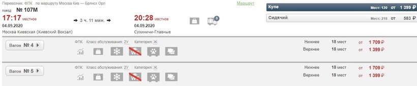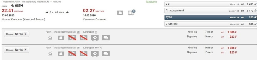 На октябрь-ноябрь минимальная стоимость билета в Сухиничи составляет 547 (поезд 131М, Сидячий), а максимальная — 5448 (поезд 741В, Люкс).