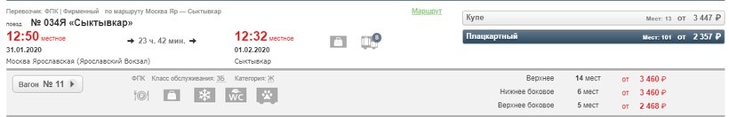 На октябрь-ноябрь минимальная стоимость билета в Сыктывкар составляет 1643 (поезд 034Я Сыктывкар, Плацкарт), а максимальная — 20969 (поезд 034Я Сыктывкар, Мягкий).