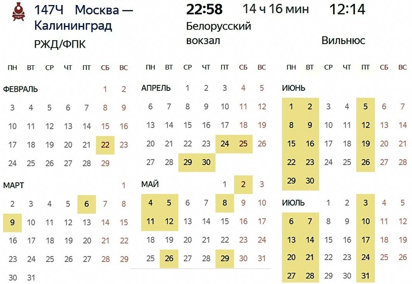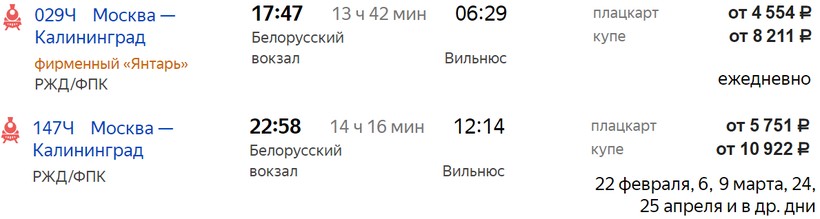 В некоторые дни в январе, феврале, марте, апреле и мае, а также каждый понедельник, вторник и пятницу в летние месяцы преодолеть направление можно на поезде Москва — Калининград № 147Ч. Отправляется состав в 22:58, прибывает в точку назначения к 12:14.