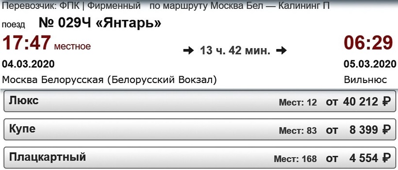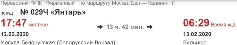 Поездка на фирменном составе № 029Ч — единственный способ преодолеть путь напрямую ежедневно круглый год. График движения поезда могу назвать удобным, потому что основную часть маршрута «Янтарь» проезжает в ночное время: отправляется из Москвы в 17:47, прибытие в литовскую столицу — к 06:29.