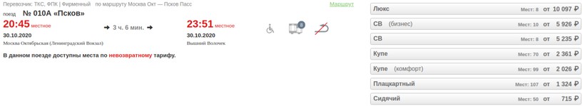 Программа динамического ценообразования применяется к стоимости проездных документов (не касается вагонов с местами для сидения и плацкартных). Благодаря ей пассажиры имеют возможность немного сэкономить на проезде, приобретая билеты заранее. Расценки на поезд № 010А «Псков» за 4 недели до путешествия: