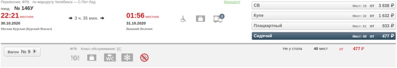 Стоимость билетов зависит от выбранного класса обслуживания. Самый бюджетный вариант — экономкласс, дороже всего обойдется место в купе-переговорной. Расценки за месяц до путешествия: