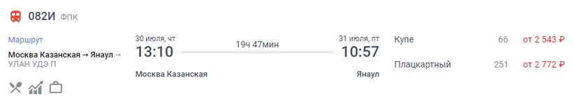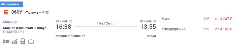На октябрь-ноябрь минимальная стоимость билета в Янаул составляет 1454 (поезд 082И, Плацкарт), а максимальная — 4876 (поезд 096Н, Купе).