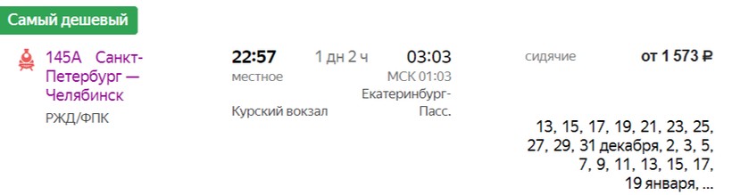 На ноябрь-декабрь минимальная стоимость билета в Екатеринбург составляет 1747 (поезд 146*А, Сидячий), а максимальная — 47500 (поезд 056М Урал, Люкс).