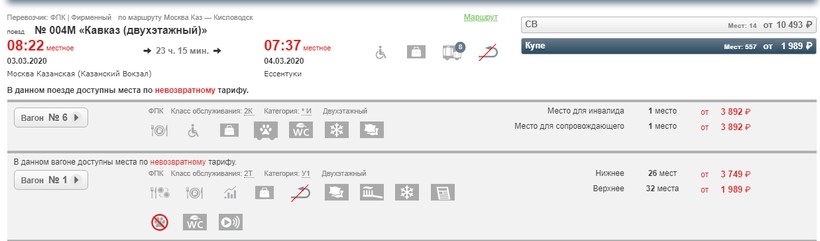 Отправление из столицы происходит с Казанского вокзала в 08:22, прибытие — 07:37. Рейс выполняется ежедневно и круглогодично. На путешествие тратится 23 часа 15 минут. По железнодорожной классификации состав скорый. Самая длительная стоянка в Минеральных Водах — приблизительно 25 минут. Будьте внимательны, состав проходящий, стоянка в Ессентуках всего 5 минут, не мешкайте с выходом. Из своего опыта могу отметить — состав отличный, есть все необходимое для комфортной поездки. Персонал преимущественно вежливый и любезный, вагоны чистые, обед вкусный, бывает (очень редко) что разбирают кипяток, нужно немного подождать. Спальные места выглядят стандартно — нижние и верхние полки. Верхние полки, в первую очередь, предназначены для отдыха, там неудобно сидеть взрослому человеку. В СВ только нижние места, полки более широкие.