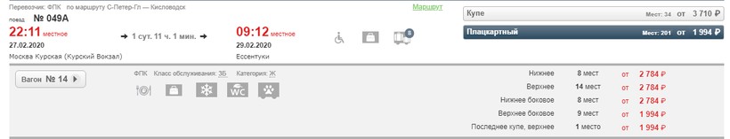 Отправляется состав с вокзала Москва-Курская в 22:11, а приходит в Ессентуки в 09:12 — удобное время, позволяет выспаться в дороге. Кроме того, в такое время общественный транспорт курсирует полным ходом, и довезет вас в любую точку города. Стоянка поезда — 4 минуты, приготовьтесь к выходу заранее (проводники предупреждают о приближении остановки). Этот рейс проходящий, для посадки в Москве имеется 38 минут. Поездка занимает 1 сутки 11 часов 1 минуту. Сам поезд очень хороший, в некоторых вагонах может немного продувать от окон, а так все чисто, опрятно. Постельное чистое, хрустящее даже, кондиционеры работают только в летний период, биотуалеты в порядке, провоз собак допустим в определенных вагонах. Имеются места для людей с инвалидностью, они в отличном состоянии. Есть возможность выбрать купе с мужскими/женскими местами.