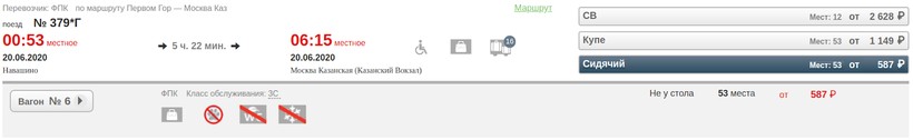 Если экономия средств играет важную роль, тогда выбирайте поезд № 379*Г. Выезжает ежедневно в 01:06/00:53, прибывает в 06:15. Продолжительность путешествия — 5 часов 9/22 минуты.