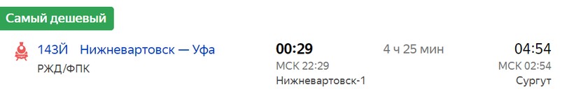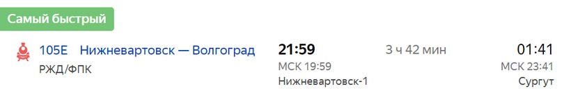 В сутки минимум шесть подходящих вариантов, уехать можно утром, днем, вечером и посреди ночи, кому как удобно. Отправление со станции Нижневартовск-1, прибытие на железнодорожный вокзал в Сургуте.