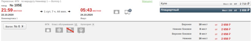 Ходит каждый день. Отправляется в 21:59 (отличный вариант для тех, кто поздно освобождается и планирует выехать после окончания рабочего дня), прибытие — в 05:43. Время в пути составляет 1 день 7 часов 44 минуты.
