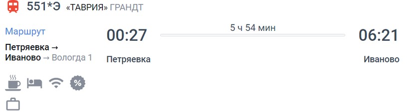 Отправляется со станции Петряевка после полуночи — 00:27, прибытие в 06:21. Время проведенное в дороге — 5 ч. 54 мин. Курсирует до конца октября один раз в три дня.