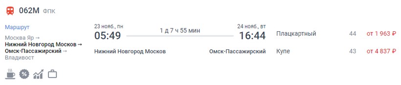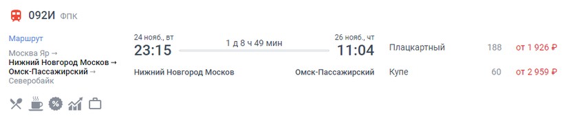 На октябрь-ноябрь минимальная стоимость билета в Омск составляет 2214 (поезд 092И Москва – Северобайкальск, Плацкарт), а максимальная — 22724 (поезд 056Ы Енисей, Люкс).