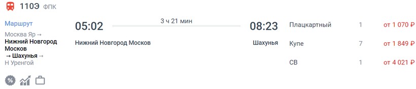 Подойдет людям, которым нужно быть в Шахунье с самого утра. Отправление — 05:02, прибытие в 08:23. Время в пути — 3 ч. 21 мин. Курсирует ежедневно.