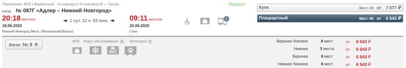 плацкарт — 6543 рубля;