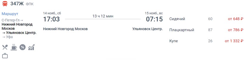 На ноябрь-декабрь минимальная стоимость билета в Ульяновск составляет 719 (поезд 347Ж, Сидячий), а максимальная — 3114 (поезд 347Ж, Купе).