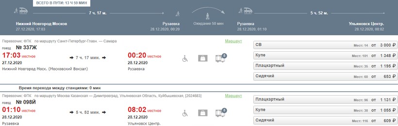 С пересадкой можно ехать в день, когда нет прямого рейса. Из Нижнего Новгорода в 17:03 идет состав № 337Ж, прибытие в Рузаевку через 7 ч. 17 мин. — в 00:20. Курсирует до конца января по нечетным числам, далее — через день. Категории вагонов: