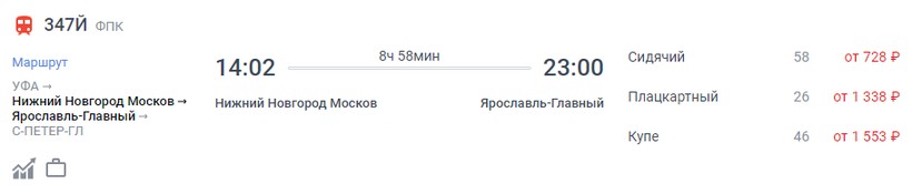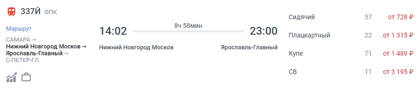 На октябрь-ноябрь минимальная стоимость билета в Ярославль составляет 572 (поезд 337Й, Сидячий), а максимальная — 3312 (поезд 347Й, Купе).