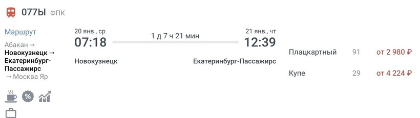 В зависимости от месяца, минимальная стоимость билета на поезд Новокузнецк (Россия) — Екатеринбург (Россия) колеблется от 2052 (ноябрь, поезд 077Ы) до 4 006 рублей (май), а в среднем купить билет можно за 3239 — 3 341 рубль.