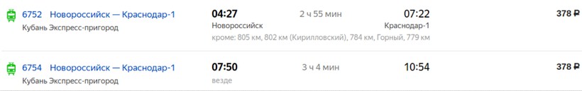 № 6752. Выезд в 04:27, прибытие через 2 часа 55 минут — в 07:22. Вариант для тех, кому нужно пораньше добраться до Краснодара.