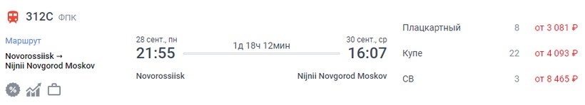 В зависимости от месяца, минимальная стоимость билета на поезд Новороссийск (Россия) — Нижний Новгород (Россия) колеблется от 1891 (ноябрь, поезд 312Э) до 3 987 рублей (август), а в среднем купить билет можно за 3087 — 3 111 рублей.