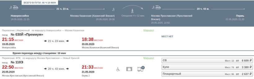 Добраться до Перми можно с пересадкой в Москве. По времени такая поездка может занять даже на 10–12 часов меньше, чем на прямом поезде. Выезд из Новороссийска в 21:15 на фирменном поезде № 030Й «Премиум», прибытие через 21 час 16 минут в 18:31 (в определенные дни график может быть другой) на Казанский вокзал столицы. Состав курсирует ежедневно, за исключением апреля. Далее предстоит пересадка в Москве, продолжительностью в 4 часа 12 минут. Нужно перейти на Ярославский вокзал. Выезд в Пермь на поезде № 110Э в 22:50, приезд через 20 часов 43 минуты в 21:33. В целом путешествие займет 1 день 22,5 часа. Сервис в составе № 030Й «Премиум» на достойном уровне — имеются биотуалеты, кондиционеры, работает вагон-ресторан, предоставляют дополнительные услуги.