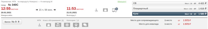 Ходит каждый четвертый день (1–2 раза в неделю). Отправляется в 12:55, прибывает через 21 час 58 минут — в 11:53. Отличный вариант для тех, кто ненавидит рано вставать.