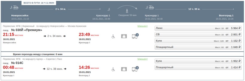 Путешествовать транзитом не так комфортно, как напрямую. Среди минусов — придется ждать следующий рейс от 20 минут и дольше, переносить багаж, пересаживаться ночью, это дороже по деньгам. Однако выехать можно в любой день, в некоторых случаях путешествие занимает меньше времени (от 16 часов и более, в зависимости от выбранного рейса). Добраться до Волгограда можно, сделав пересадку в Краснодаре. Отправление из Новороссийска (в 21:15) на фирменном поезде № 030Й «Премиум», прибытие через 2,5 часа — в 23:49. Рейс ежедневный.