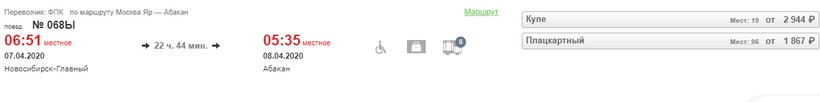 Отправление — 06:51/06:56, прибытие — 05:35. Время в пути — 22 часа 44 минуты/22 часа 39 минут. Курсирует через день. На маршруте 30 остановок, самая продолжительная на станции Ачинск-1 — 1 час 25 минут. Немного о сервисе: