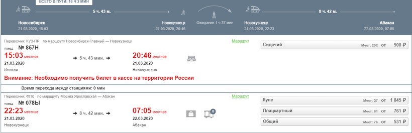 До Новокузнецка можно купить проездной документ только в вагон с сидячими местами, он будет стоить 800 руб. Важно помнить, что билет нужно получить в кассе на территории РФ. На вторую часть маршрута можно купить проездной документ в такие вагоны:
