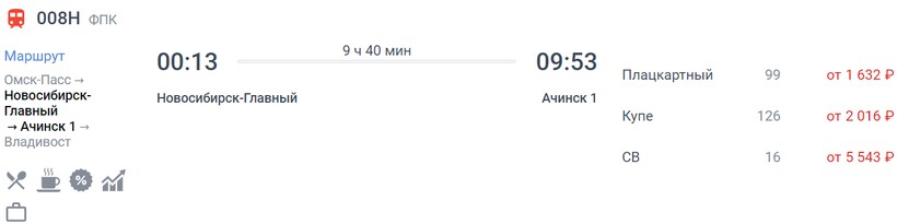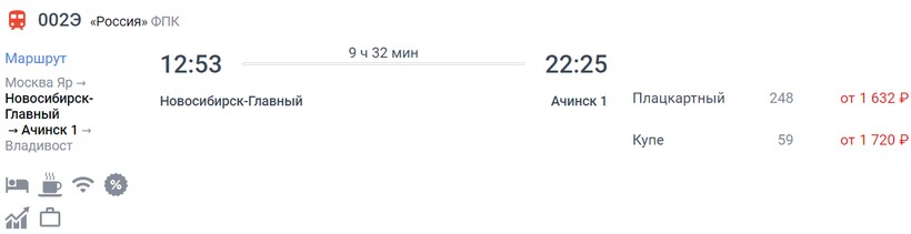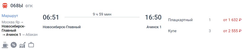На октябрь-ноябрь минимальная стоимость билета в Ачинск составляет 957 (поезд 230*С, Плацкарт), а максимальная — 7730 (поезд 062М, Люкс).