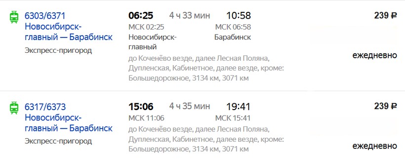 Ежедневно до Барабинска можно доехать на 2 пригородных поездах: