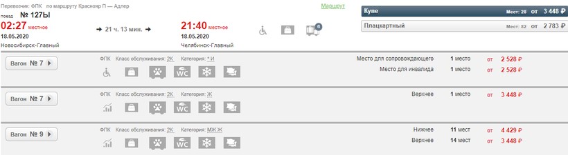 Поездка в плацкарте стоит 2731 ₽, а в купе — 3327 ₽. Цены указаны за месяц до выезда.