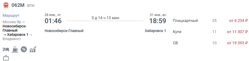 На октябрь-ноябрь минимальная стоимость билета в Хабаровск составляет 4040 (поезд 002Щ Россия, Плацкарт), а максимальная — 40252 (поезд 002Щ Россия, Люкс).