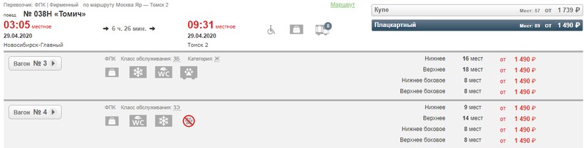 В зависимости от месяца, минимальная стоимость билета на поезд Новосибирск (Россия) — Томск (Россия) колеблется от 498 (ноябрь, поезд 602Н) до 1 586 рублей (сентябрь), а в среднем купить билет можно за 579 — 728 рублей.