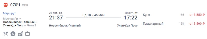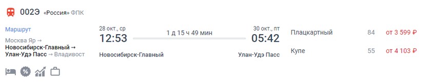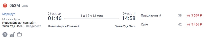На октябрь-ноябрь минимальная стоимость билета в Улан-Удэ составляет 2338 (поезд 002Щ Россия, Плацкарт), а максимальная — 23478 (поезд 002Щ Россия, Люкс).